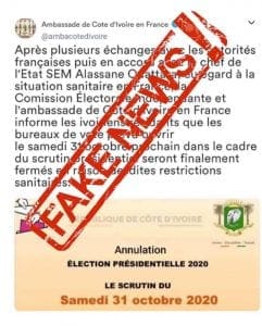 Depuis quelques heures des informations circulent sur les réseaux sociaux faisant état de ce que les bureaux de vote pour la présidentielle ivoirienne du 31 octobre 2020 seraient fermés pour raison de Covid-19. Une information très vite rectifiée par l’ambassade de Côte d’Ivoire en France.