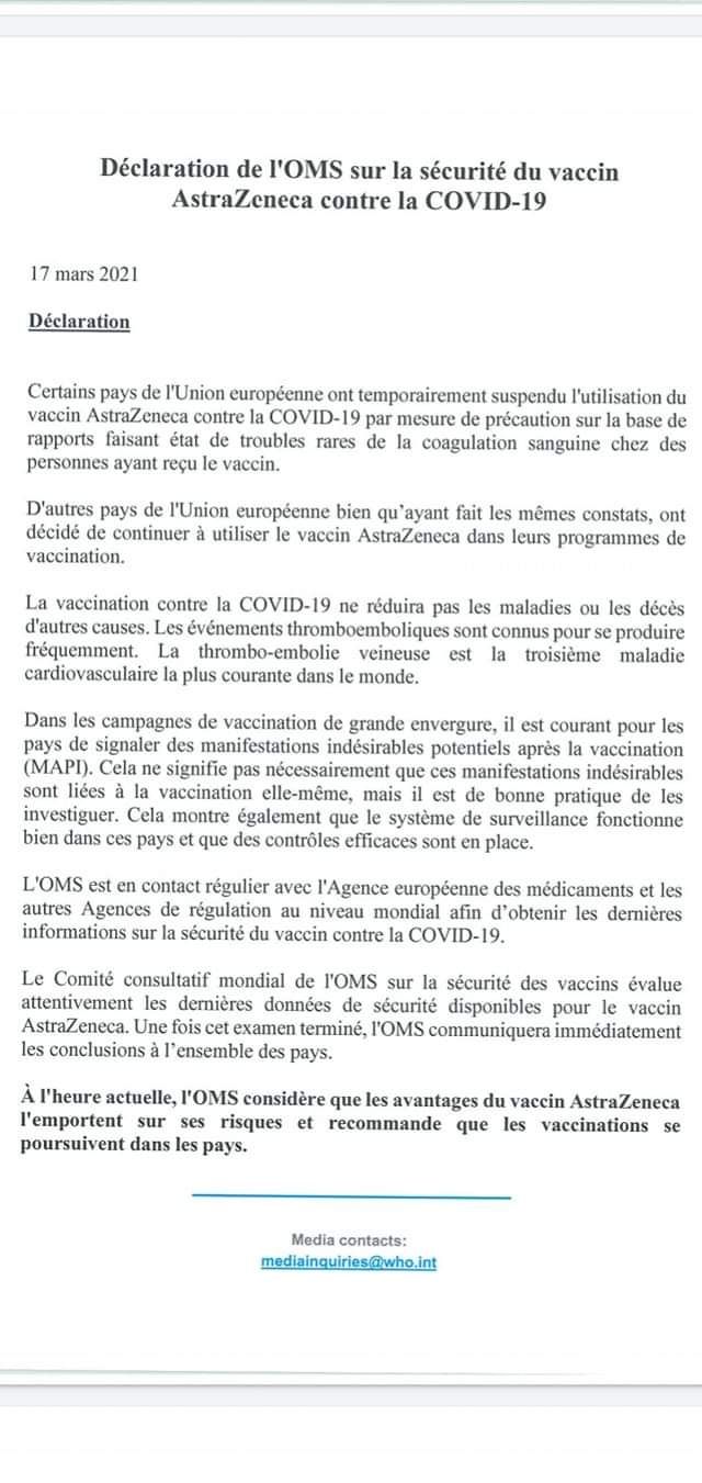 Déclaration de l’OMS sur la sécurité du vaccin AstraZeneca