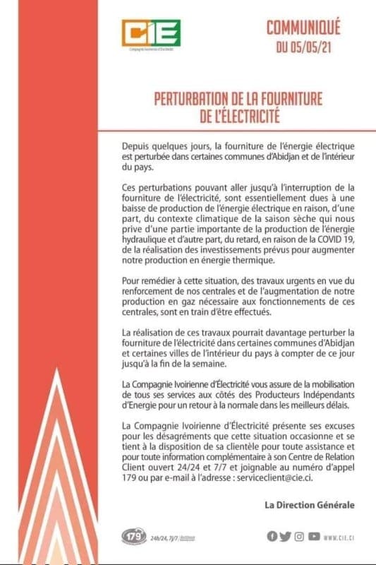 Devant les coupures d’électricité récurrentes ces dernières semaines et la colère des populations ivoiriennes qui monte ,la Compagnie ivoirienne d’électricité a pondu un communiqué ce mercredi 05 mai pour s’expliquer.
