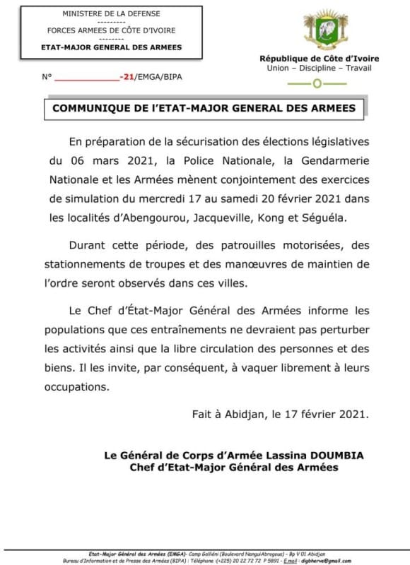 C’est d’ailleurs dans l’optique de décourager tous ceux qui auraient pour lugubre dessein de perturber les prochaines élections législatives que des exercices de simulation sont ménées dans plusieurs villes ivoiriennes.« En préparation de la sécurisation des élections législatives du 06 mars 2021, la Police Nationale, la Gendarmerie Nationale et les Armées mènent conjointement des exercices de simulation du mercredi 17 au samedi 20 février 2021 dans les localités d’Abengourou, Jacqueville, Kong et Séguéla. »,rapporte un communiqué du Général de Corps d’Armée Lassina DOUMBIA, Chef d’Etat-Major Général des Armées