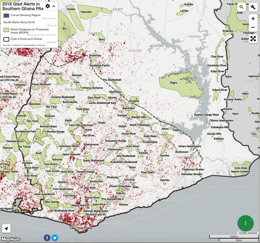 « La carte de responsabilité du cacao 3.0 s’appuie sur le travail pionnier de Mighty Earth pour établir un mécanisme de suivi conjoint pour le cacao », déclare Samuel Mawutor, conseiller principal chez Mighty Earth. « Bien que plusieurs acteurs du secteur fassent de grands progrès pour divulguer plus d’informations sur leur chaîne d’approvisionnement mondiale, le secteur manque toujours de transparence et de responsabilité. Cette carte comble le vide et fait le travail que l’industrie et le gouvernement ont promis, trois ans auparavant, de faire dans le cadre de l’Initiative Cacao et Forêts. Nous sommes fiers de collaborer avec nos partenaires Vivid Economics, Trase et Enveritas pour rendre plus efficace la surveillance de l’environnement et des droits de l’homme, en même temps. »