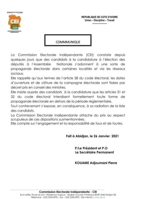 Une situation contre laquelle la CEI s’insurge. »La Commission Electorale Indépendante (CEI) constate depuis quelques jours que des candidats à la candidature à l’élection des députés à l’Assemblée Nationale s’adonnent à une sorte de propagande électorale dans certaines localités et via les réseaux sociaux. »,lit-on dans un communiqué pondu ce mercredi.