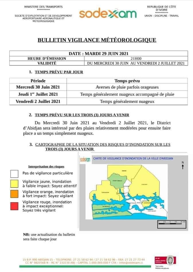 Sous le feu de grosses pluies depuis plusieurs semaines ,Abidjan n’est pas au bout de ses peines .La Sodexam annonce encore quelques averses les trois prochains jours.Il s’agit de ce mercredi 30 juin,le jeudi 1er et vendredi 2 juillet.