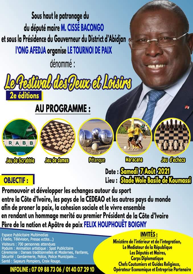 Voici un pan des objectifs du Tournoi de l’Amitié et de la Solidarité initié depuis 2020 par l’ONG AFEDJA (Afrique – Europe Djafoué). Dénommé « Le festival des Jeux et Loisirs », l’évènement qui sera à sa 2è édition cette année, aura lieu le 07 Août prochain au stade Wolé Basile de Koumassi. Personnalité toujours prompt quand il s’agit d’apporter du baume au cœur de ses concitoyens, le Député – maire Cissé Bacongo a accepté d’être le patron dudit tournoi. A ses côté, le Gouverneur du District d’Abidjan qui lui, sera le président de la manifestation.