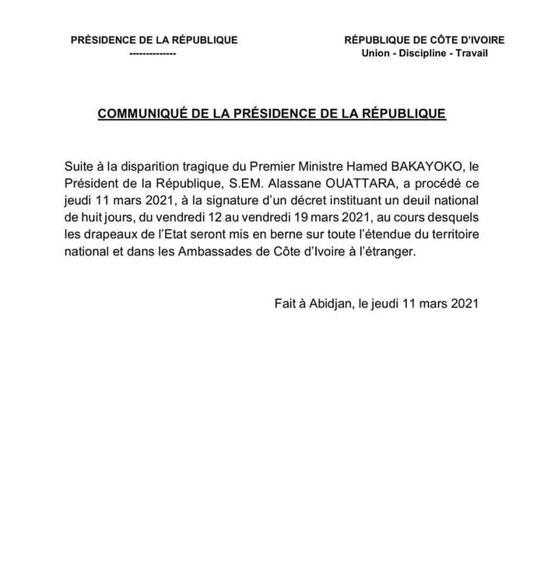 Suite à la disparition tragique du Premier Ministre Hamed BAKAYOKO, le Président de la République, S.EM. Alassane OUATTARA, a procédé le jeudi 11 mars 2021, à la signature d’un décret instituant un deuil national de huit jours, du vendredi 12 au vendredi 19 mars 2021, au cours desquels les drapeaux de l’Etat seront mis en berne sur toute l’étendue du territoire national et dans les Ambassades de Côte d’Ivoire à l’étranger.